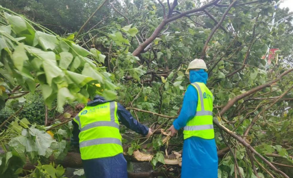 (图为中国太保产险泉州共享作业中心查勘员在查勘路上清理挡路树枝)