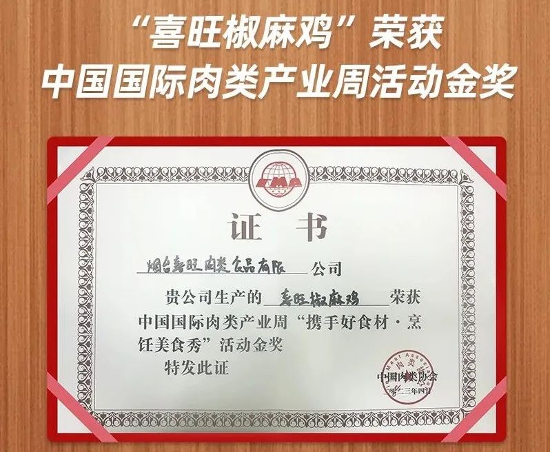 中国国际肉类产业周是亚洲规模和影响力都较大的肉类全产业链的展览和顶级盛会,有中国肉类产业发展风向标之称。迄今为止,已有世界四十多个国家和地区的肉类行业企业参展,近三十万人次观众、采购商、经销商莅临。在刚刚结束的2023中国国际肉类产业周中喜旺椒麻鸡成功斩获烹饪美食秀活动金奖。以其麻、辣、鲜、香,肉质紧实,风味独特等特点,一举虏获评委的味蕾。