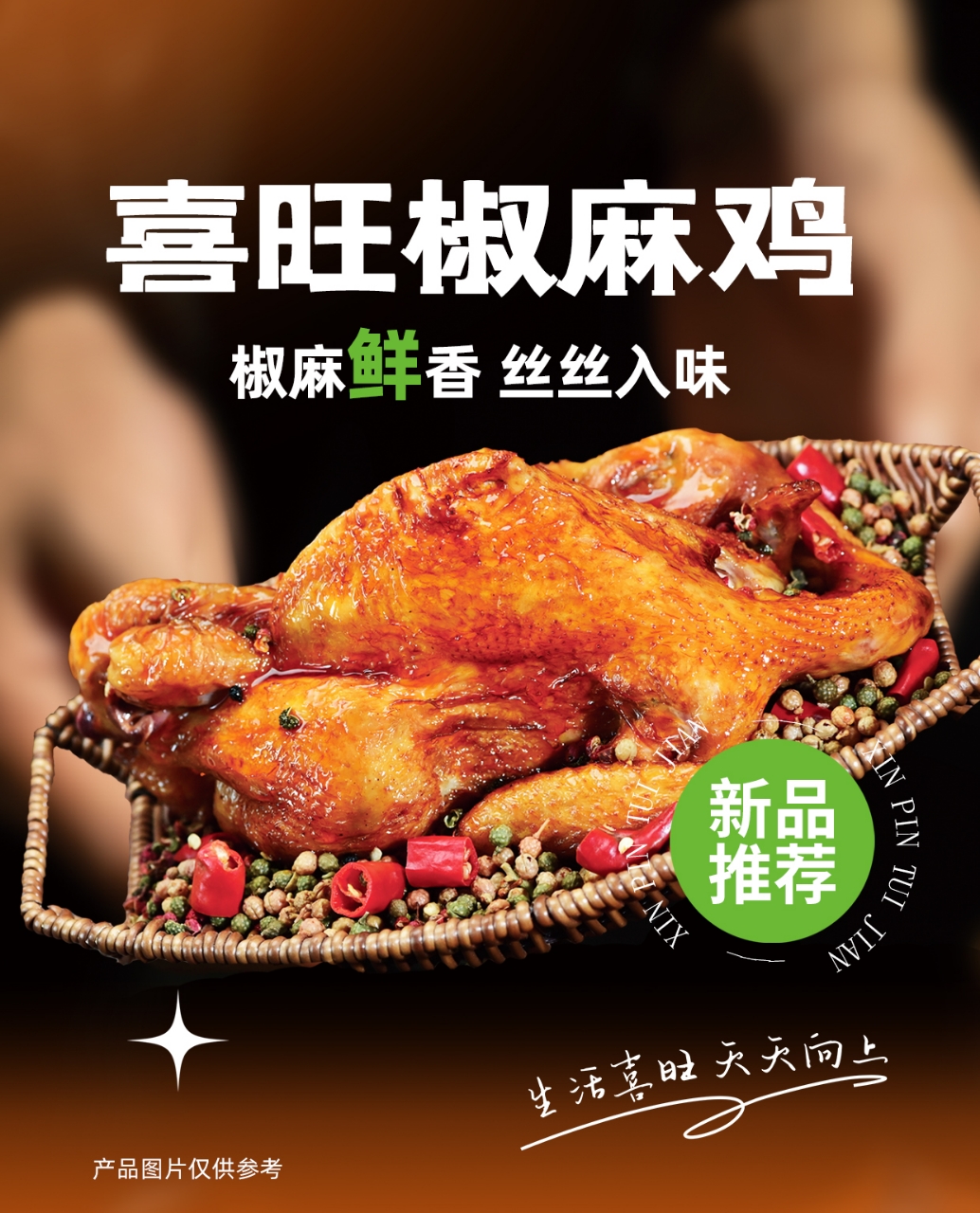 喜旺新品椒麻鸡精选生长周期100天以上的小公鸡,采用高品质川味青花椒,色泽更鲜艳,香味更浓郁,辣味更独特,麻味更持久。使用精选辣椒填充,老汤慢炖,保证产品熟软离骨,软而不散。麻椒独特的口味与鸡肉的鲜香美妙结合,麻辣浓香,辣而不燥,肉香、料香、椒香三者自然融合,入口椒麻鲜香、丝丝入味,加热后,椒香浓郁,味道更好。